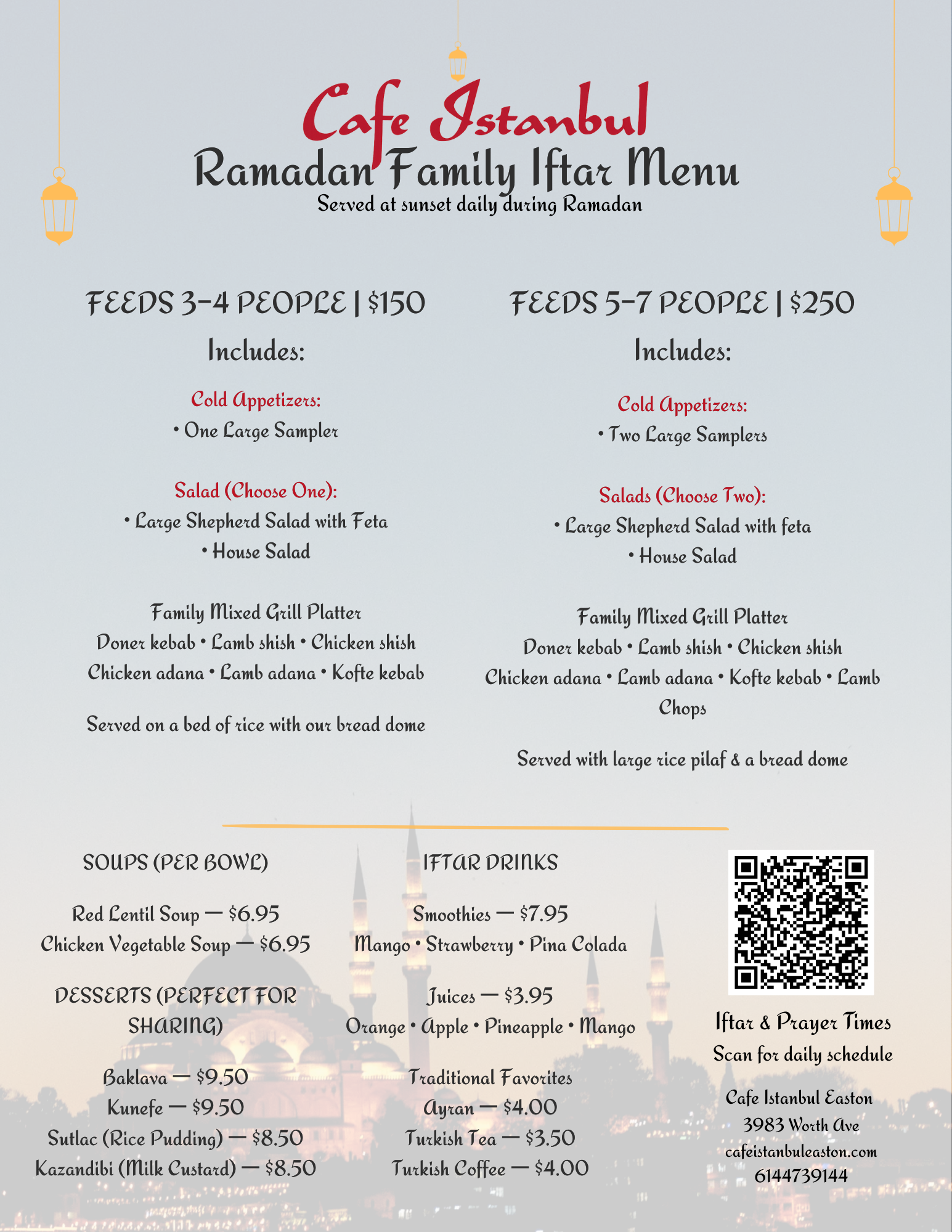 Step into Cafe Istanbul Easton, where the essence of Turkish cuisine comes alive in a lively setting. Our dishes, from tender kebabs to savory falafel, celebrate authentic recipes and carefully selected spices. Enjoy your meal in our uniquely decorated space, offering a taste of Turkish culture and warmth. Whether you're here for an intimate dinner or a lively gathering, our team is dedicated to making your dining experience unforgettable. Visit us at Cafe Istanbul Easton, where every meal is a journey through tradition and flavor.
